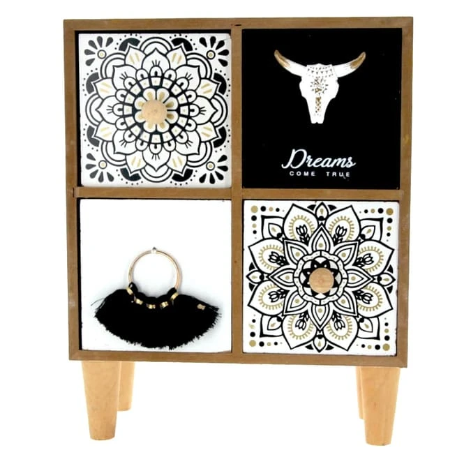 Sie möchten unansehlichen Krimskrams effektiv aus dem Blickfeld beseitigen und sind infolgedessen auf der Suche nach einer außergewöhnlichen Aufbewahrungsmöglichkeit, die sich vollkommen nach Belieben in Szene setzen lässt? Dann werden Sie die hinreißende Dekobox lieben! Diese ist nicht nur eine gelungene Neuinterpretation des Klassikers, sondern darüber hinaus auch genau das Richtige, um der Fantasie beim Schmücken freien Lauf zu lassen. Sie besteht aus Holz, ist ca. 19,5 x 10 x 25 cm groß und mit vier liebevoll gestalteten Schubladen ausgestattet, die sich hervorragend zur Aufbewahrung von Haargummis, Schmuck und Co. eignen. Aus diesem Grund ist die niedliche Schubladenbox genau das Richtige für echte Trendsetter und solche, die nicht genug von geschmackvoller Dekoration bekommen. Also schnappen Sie sie sich und toben Sie sich beim Befüllen munter aus!