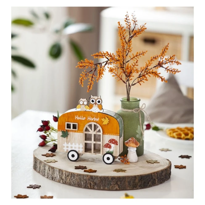 All diejenigen Trendsetter, die die goldenen Monate mithilfe herbstlicher Dekoration willkommen heiĂen und ĂŒberdies persönliche Akzente in den heimischen vier WĂ€nden setzen möchten, kommen mit dem tollen DekohĂ€nger vollends auf ihre Kosten! Dieser kommt in Form eines liebevoll gestalteten Wohnwagens daher, welcher sich hervorragend dazu eignet, um die Fantasie beim SchmĂŒcken frei walten zu lassen. Er besteht aus Holz, misst ca. 18 x 5 x 19,5 cm und zieht mithilfe der liebenswerten Eulen sowie der herbstlichen Pilze mit Leichtigkeit alle Blicke auf sich. Ganz gleich, ob an einer geeigneten Stelle aufgehĂ€ngt oder liebevoll auf dem Tisch oder Regal in Szene gesetzt – mit dem niedlichen Deko-Wohnwagen bleiben fortan keinerlei WĂŒnsche mehr offen. Also schnappt ihn euch und erlebt grenzenlosen DekospaĂ!
