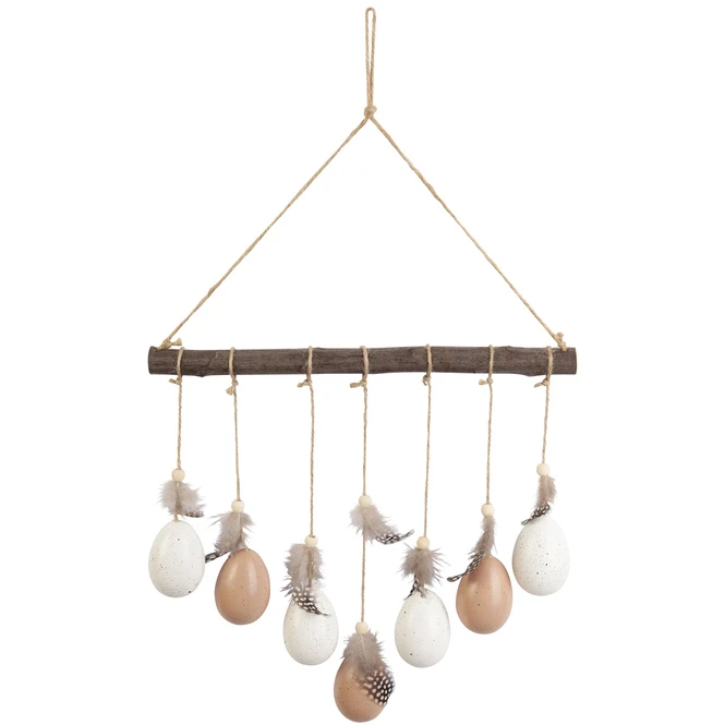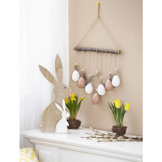 Mit dem niedlichen DekohĂ€nger könnt ihr eure vier WĂ€nde binnen Sekunden in ein wohliges Osterambiente tauchen und zeigen, dass ihr ein HĂ€ndchen fĂŒr echte Trends habt! Dieser eignet sich nĂ€mlich ideal, um der Fantasie beim frĂŒhjĂ€hrlichen SchmĂŒcken freien Lauf zu lassen und grenzenlosen DekospaĂ zu erleben. Er besteht aus Holz, misst ca. 30 x 4 x 50 cm und kommt mit einer Reihe dekorativer Eier samt Federn daher, welche sich bei Bewegung zart im Wind wiegen. Mithilfe der natĂŒrlichen Farben fĂŒgt sich der tolle Deko-Ast nahtlos in jeden Raum ein und ist somit genau das Richtige, um die blĂŒhende Jahreszeit stilecht willkommen zu heiĂen. Also schnappt ihn euch und holt euch das Osterfest mĂŒhelos in euer Zuhause!