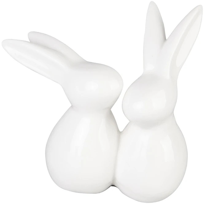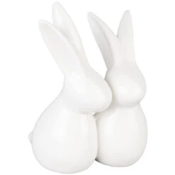 Sie stehen für Fruchtbarkeit und sind neben Eiern das Ostersymbol schlechthin: Hasen. Aus diesem Grund dürfen sie im Frühjahr in keinem österlich hergerichteten Zuhause fehlen. Wenn Sie auf der Suche nach besonders dekorativen Stücken sind, mit denen Sie Ihre vier Wände binnen Sekunden in ein wohliges Frühlingsambiente tauchen können, haben wir hier genau das Richtige! Die niedlichen Dekohasen kommen als miteinander verbundenes Pärchen daher und eignen sich hervorragend, um den Lenz stilvoll willkommen zu heißen. Das Element besteht aus glänzendem Keramik, ist in einer von zwei tollen Ausführungen erhältlich (eine Vorauswahl ist leider nicht möglich) und insbesondere dank dem zeitlosen Weiß ein echter Hingucker, dem Dekofans ganz sicher nicht widerstehen können. Ganz gleich, wohin Sie sie stellen und mit welchen anderen österlichen Stücken Sie sie kombinieren – das liebenswerte Hasenpärchen ist in jedem Fall das stilvolle Highlight eines jeden geschmückten Heims.