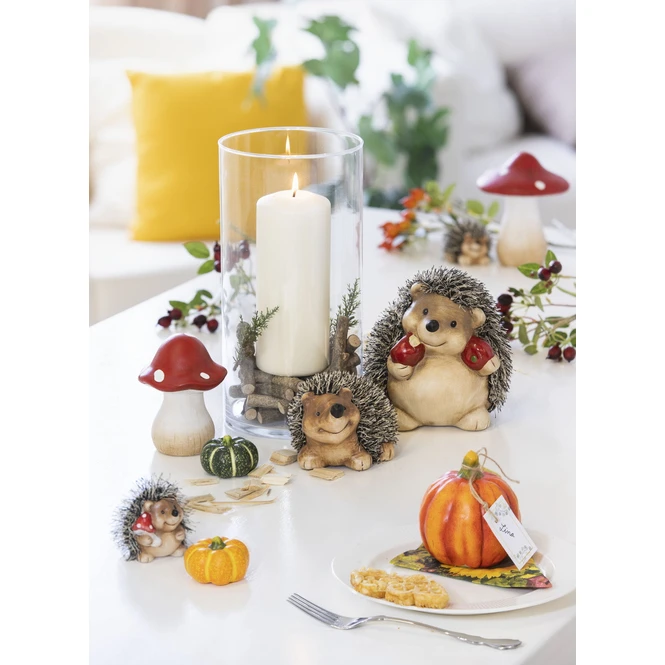 Sie sehen nicht nur liebenswert aus, sondern sind eines der Herbstsymbole schlechthin: Igel. Diese possierlichen Tierchen gehören in der stürmischen Jahreszeit ebenso dazu wie Kürbisse, Drachen oder Pilze und sind auch aus der Dekoration nicht wegzudenken. Wenn Sie auf der Suche nach einem besonderen Dekoelement sind, welches Sie den Herbst auf besondere Weise begrüßen lässt, haben wir hier genau das Richtige. Der hinreißende Igel eignet sich hervorragend, um Sie und Ihre Lieben binnen Sekunden in eine herbstliche Stimmung zu versetzen. Er besteht aus Terrakotta und ist insbesondere dank dem farbenfrohen Fliegenpilz sowie dem kuschelweichen Fell ein echter Blickfang. Mit einer Größe von 11 x 10,5 x 12 cm fügt sich das niedliche Kerlchen nahtlos in jeden Raum hinein und verbreitet eine wohlige Herbstatmosphäre, von der Sie und Ihre Lieben niemals genug bekommen.