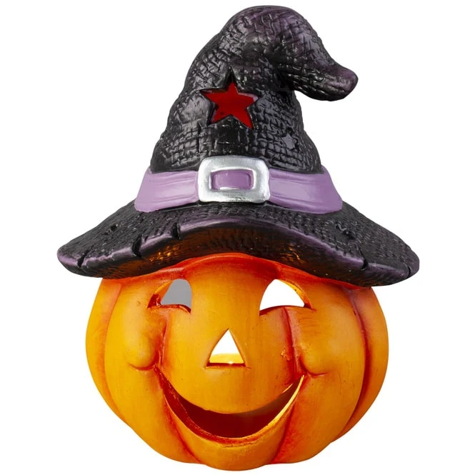 Sie sind das Halloweensymbol schlechthin und sollen im ausgehöhlten Zustand und mit eingeritzem Gesicht sowie brennender Kerze Gespenster vom eigenen Heim abhalten – die Rede ist von Kürbissen. Diese sind in der Nacht zu Allerheiligen ebenso unverzichtbar wie fürchterliches Krabbelgetier, klapperige Skelette oder „Süßes-oder-Saures“. All diejenigen, die auf der Suche nach einem besonderen Stück für ihre Gruselfeier sind und keine Lust auf langweilige Standards haben, kommen mit dem niedlichen Windlicht vollends auf ihre Kosten! Dieses kommt in Form eines hinreißenden Kürbis daher, welcher vor allem aufgrund des stattlichen Huts sowie freundlichen Lächelns mühelos alle Blicke auf sich zieht. Er besteht aus Terrakotta, ist ca. 12 x 10 x 15 cm groß und verbreitet in Kombination mit einer Kerze (nicht im Lieferumfang enthalten) jederzeit eine wohlige Atmosphäre. Ob im Hausflur, Wohn- oder Esszimmer – an dem tollen Dekokürbis wird sich so schnell niemand sattsehen.